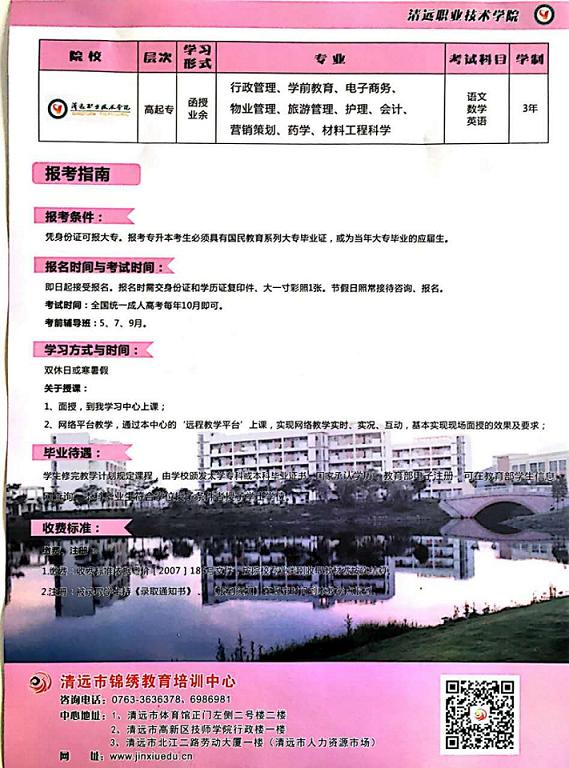 共青團(tuán)清遠(yuǎn)市委員會2017年圓夢計劃正式啟動!【北京大學(xué)圓夢計劃,圓你大學(xué)夢】成人本科:北京大學(xué)(網(wǎng)絡(luò)教育)符合條件者3年共交學(xué)費2000元,專科:清遠(yuǎn)職業(yè)技術(shù)學(xué)院(成人函授),符合條件者3年共交學(xué)費1000元,就能完成學(xué)業(yè),輕松拿證!另外,企業(yè)人力資源管理師職業(yè)資格考證、叉車上崗證考證等現(xiàn)火熱接受報名中,歡迎有志提升自己的朋友咨詢報名。咨詢熱線:成老師0763-3630112  15816286696微信同步 報名地址:清遠(yuǎn)市北江二路勞動大廈一樓