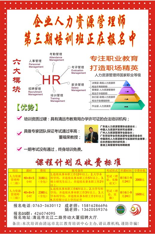 企業(yè)人力資源管理師第三期培訓班正式開始報名,歡迎各位有意向了解或者想考的小伙伴到勞動大廈一樓現(xiàn)場咨詢。本次培訓由清遠市北江教育培訓中心主辦,請認準機構,謹防受騙。